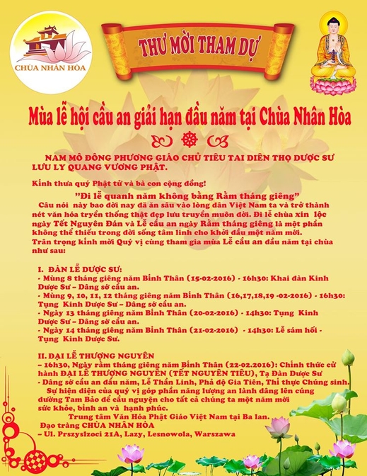 - 16h30 - Ngày rằm tháng giêng năm Bính Thân (22 - 2 – 2016): Chính thức cử hành ĐẠI LỄ THƯỢNG NGUYÊN (TẾT NGUYÊN TIÊU), Tạ Đàn Dược Sư – Dâng sớ cầu an đầu năm, Lễ Thần Linh, Phả độ Gia Tiên, Thí thực Chúng sinh.