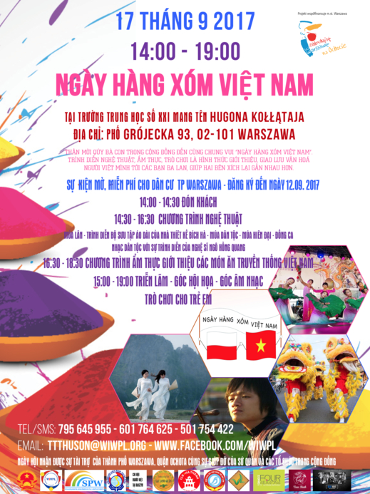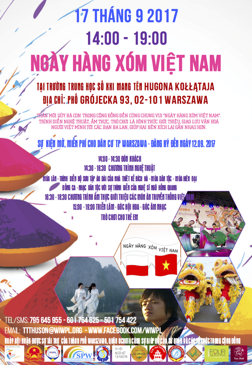 Thân mời quý bà con trong cộng đồng đến cùng chung vui “NGÀY HÀNG XÓM VIỆT NAM” – một chương trình văn hóa rất phong phú, đặc sắc: ca múa nhạc, ẩm thực, trò chơi …Đây là một sự kiện giới thiệu, giao lưu văn hóa của người Việt với các bạn Ba Lan nhằm giúp hai bên xích lại gần nhau hơn.
