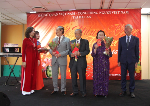Nhân dịp này, tham tán lãnh sự ĐSQ VN Nguyễn Thị Minh Nguyệt, ông Nguyễn Văn Thái, UVTW Mặt trận tổ quốc Việt Nam, phó chủ tịch Hội người Việt Nam tại Ba Lan,thay mặt BTC có món quà mừng tuổi các cụ cao niên trong cộng đồng. Bà Nguyễn Thị Minh nguyệt, người mới sanh nhận nhiệm vụ tại Ba Lan khoảng 1 tháng trước cũng lần lượt đi thăm hỏi và chúc Tết bà con cùng các vị quan khách Ba Lan.