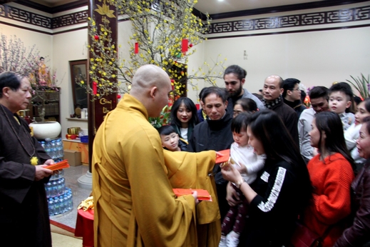 Đại đức Thích Trung Đạt lì xì chúc may mắn cho bà con.