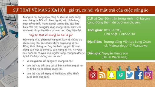 Mạng xã hội đang ngày càng đi sâu vào cuộc sống của chúng ta. Đối với nhiều người, việc hình dung cuộc sống thiếu mạng xã hội là một điều quá khó hiểu. Với một số người khác, mạng xã hội được coi như một sản phẩm tiêu cực của cuộc sống hiện đạị. Vậy sự thật về mạng xã hội là gì? Hãy cùng nhau phân tích và tranh luận về những ưu điểm cũng như các nhược điểm của mạng xã hội. Đồng thời, chúng ta cũng tìm hiểu nguyên lý hoạt động của một số công cụ của mạng xã hội. Hy vọng sau buổi nói chuyện, mỗi người trong chúng ta đều sẽ tự trả lời được những câu hỏi như: Vì sao giới trẻ dễ bị nghiện mạng xã hội? làm thế nào để sống vui vẻ bên cạnh mạng xã hội (vì từ bỏ nó thì không được rồi)? làm thế nào để mạng xã hội không điều khiển cuộc sống của bạn?