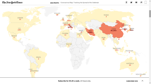 Asia: China (80 380), South Korea (5 328), Iran (2 336), Japan (268), Singapore (110), Kuwait (56), Bahrain (49), Thailand (43), Taiwan (42), Malaysia (36), United Arab Emirates (27), Iraq (26), Vietnam (16), Lebanon (13), Israel (10), Qatar (8), Oman (7), India (6), Pakistan (5), Philippines (3), Indonesia (2), Afghanistan (1), Cambodia (1), Jordan (1), Nepal (1), Saudi Arabia (1) and Sri Lanka (1).