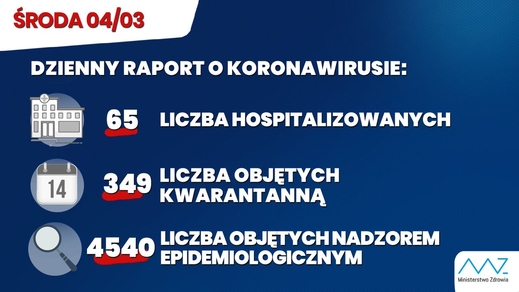 Phát hiện từ đêm, nhưng tới 8:05 đích thân bộ trưởng bộ Y Tế, người đã chuẩn bị cho giờ phút này từ tuần trước công bố trường hợp dương tính CoVy đầu tiên ở Ba Lan. Một bác 60 tuổi trở về từ Đức. Nhanh chóng cơ quan chức năng xác định được lái xe, và những tài xế trên xe. Tới chiều tài xế đã bị cách ly. Cơ quan dịch tể ở 15 thành phố sẽ đến từng hành khách để cách ly. Cả gia đình bệnh nhân cũng đã được chở tới bệnh viện khám và cách ly.