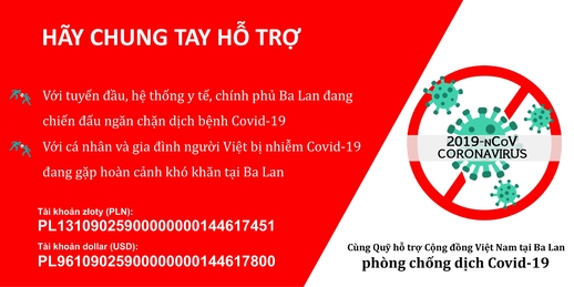 Nhằm tạo nên sức mạnh tổng hợp vượt qua giai đoạn đầy khó khăn này, đẩy lùi dịch bệnh, bảo vệ sức khỏe, tính mạng và lợi ích của bà con, nâng cao uy tín cộng đồng, Ban, Quỹ Hỗ trợ cộng đồng người Việt Nam tại Ba Lan phòng chống dịch covid-19, Hội người Việt Nam tại Ba Lan, xin trân trọng ngỏ lời kêu gọi các nhà hảo tâm, các doanh nghiệp, các tổ chức trong cộng đồng, các cá nhân và các bạn gần xa, bằng sự đóng góp của mình, hãy chung tay hỗ trợ, động viên chia sẻ với lực lượng tuyến đầu, với chính quyền và hệ thống y tế Ba Lan đang chiến đấu ngăn chặn dịch bệnh, với cá nhân và gia đình bị nhiễm bệnh đang gặp hoàn cảnh khó khăn.