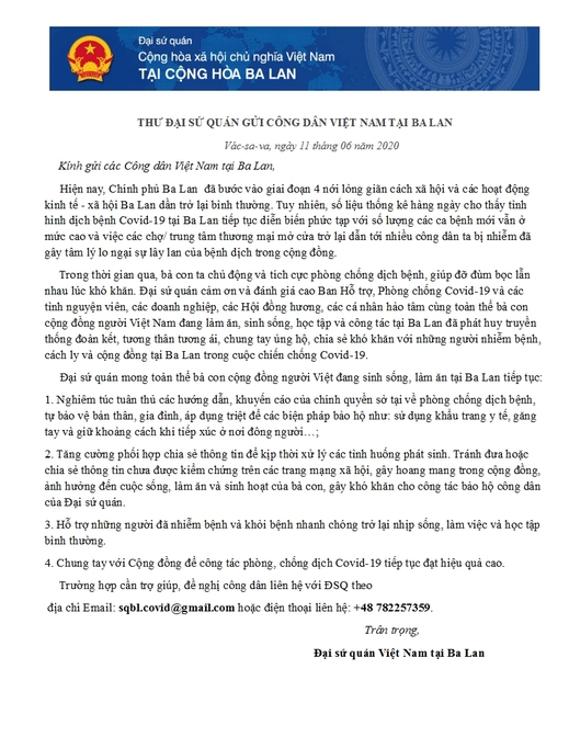 Đại sứ quán mong toàn thể bà con cộng đồng người Việt đang sinh sống, làm ăn tại Ba Lan tiếp tục:
