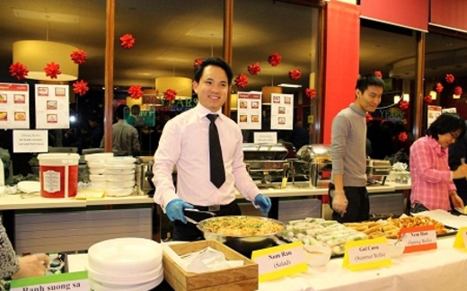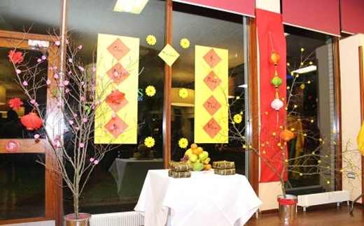 Khách tới tham dự được thưởng thức các món ăn truyền thống của Việt Nam như xôi gấc, nem, giò lụa, gà rang muối, nộm… Mâm ngũ quả cũng được bày biện khéo léo bên bánh chưng, hoa mai, hoa đào và bức thư pháp ngày Tết. Toàn bộ không gian của chương trình được trang trí với hai màu đỏ, vàng tượng trưng cho sự may mắn, thịnh vượng và tốt đẹp. Bạn bè quốc tế rất hào hứng lưu lại những bức ảnh kỷ niệm với không gian Tết Việt và nhiệt tình tham gia phần đố vui về phong tục ngày Tết ở Việt Nam.