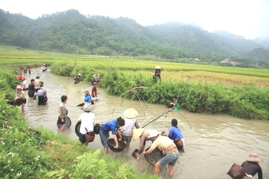 Hàng chục người trong bản xúm vào hò reo bắt cá theo một tập tục cộng đồng