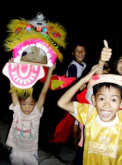 Cùng với rước đèn, trẻ em ngày xưa còn có thú vui múa sư tử vào dịp Trung thu. Hiện nay tục lệ trẻ em múa lân dưới trăng vẫn còn được lưu truyền ở vài tỉnh miền Trung. Đầu lân đủ cỡ, đủ loại, và hình dáng hơi khác nhau tùy địa phương. Múa cùng với lân là ông thổ địa bụng phệ phe phẩy cái quạt nan. Thích nhất là được phép gõ trống ồn ào thỏa chí mà không bị mắng. Có thấy cảnh các em nhỏ đốt đuốc múa lân thấp thoáng dưới tàn đa, rặng tre trong ánh sáng trăng ngoài làng quê, mới cảm được nét nên thơ trong sáng của đêm Rằm tháng Tám Việt Nam. Trong khi thiếu nhi rước lân với niềm vui hồn nhiên, thì các anh lớn ở tuổi mười ba, mười bốn họp nhau lại thành từng đoàn múa lân lấy thưởng. Từng khu phố náo loạn cả lên…