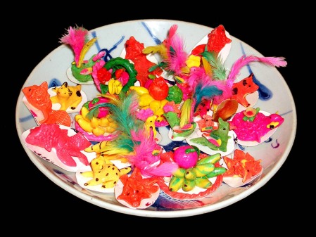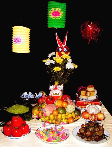 Từ mấy ngày trước Tết, mẹ tôi đã lo mua sắm các thứ cần thiết cho mâm cỗ tháng Tám. Mỗi nhà có cách sửa soạn mâm cỗ khác nhau, nhưng một cỗ Trung Thu cổ truyền bắt buộc phải có mâm ngũ quả, với na (mãng cầu), bưởi, cam, quýt, lựu. Nhưng quan trọng nhất vẫn là hồng, cốm và chuối tiêu chín nám trứng cuốc. Món không thể thiếu khác trên mâm cỗ là các loại bánh nướng, bánh dẻo đi cùng với trà ướp sen. Và còn phải có bánh con lợn, con cá nho nhỏ cho trẻ con.