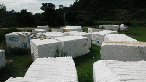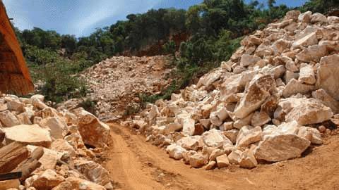 | Những thớt đá trắng đã khai thác được vứat chỏng chơ hai bên đường vào vũng lõi đá trắng Châu Hồng, Châu Lộc (huyện Quỳ Hợp, Nghệ An) chờ ngày... xuất ngoại. |