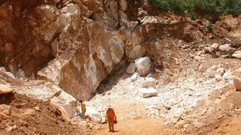 Mỏ tiếp mỏ. Những khối đá trắng khổng lồ được bóc tách từ các vỉa nằm lăn lóc dọc hai bên đường. Màu trắng của đá trải dài một vệt nhức mắt. Con đường bụi mù và đỏ quạch chạy xen giữa, vô tình kẻ một đường như một dòng sông “bơi” qua một vùng miên man màu trắng, nếu nhìn từ xa.