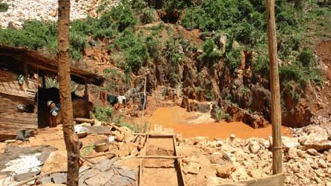 Liền kề với điểm khai thác mỏ đá trắng, điểm khai thác quặng thiếc đã biến khe núi thành những rảnh và những hố sâu hoắm đỏ quạch bùn đất.