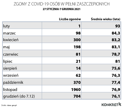 Như vậy: từ ngày 27 tháng 1 đến ngày 7 tháng 12 đã có 50.743 người chết ở Ba Lan do COVID-19 hoặc liên quan đến các bệnh đi kèm. Những người được tiêm chủng đầy đủ chiếm 7,5% trong nhóm này (3809 người). Điều này có nghĩa là 92,5% những người chết do COVID-19 không được tiêm chủng (46.934 người).