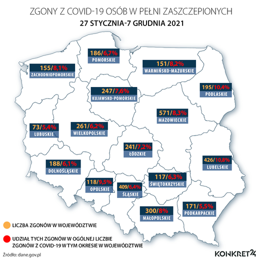Trong dữ liệu được phân chia theo các tỉnh cho thấy, hầu hết các trường hợp tử vong do COVID-19 xảy ra ở những người không được tiêm chủng. Chỉ ở hai tỉnh Lubelskie và Podlaskie, tỷ lệ số người được tiêm chủng trong tổng số ca tử vong vượt quá 10%. (Lần lượt là 10,8% và 10,4%).