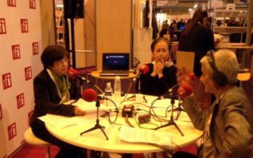 Tiến sĩ Lê Thị Xuyến (trái), Trưởng ban Việt học tại Đại học Paris 7 trong studio của RFI Việt ngữ tại Expolangue 2014, ngày 6/2/2014.