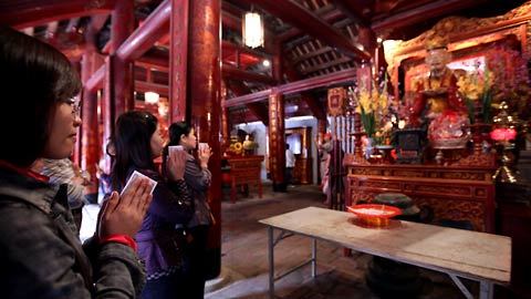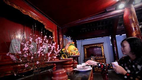 | Trước bàn thờ Chu Văn An, hiệu trưởng đầu tiên của Quốc Tử Giám, luôn đông người khấn nguyện với những xấp tiền lẻ trên tay |