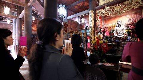 Trước bàn thờ Khổng Tử, người khai sinh Đạo Khổng, lúc nào cũng người người chen chân khấn vái với xấp tiền lẻ kẹp chặt giữa hai bàn tay. |