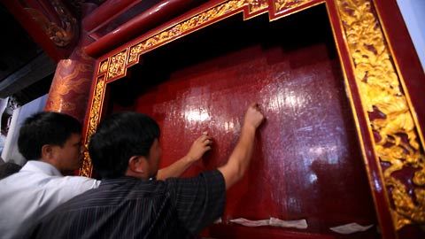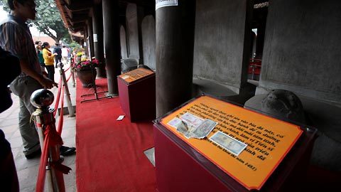 | Để tránh cho các cụ rùa bị dẫm đạp như mọi năm, năm nay, hàng bia đá được chăng dây cảnh báo. Người đến cầu lại đặt tiền lẻ lên những mặt hộp gỗ có trích dịch văn bia các khoa thi xưa. |