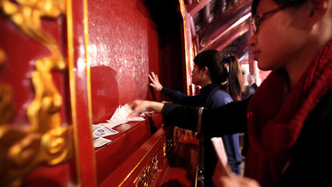 | Những cô gái này tin rằng, cứ đặt tiền lẻ và viết lời ước nguyện của mình lên tấm bảng là sẽ đỗ đạt? |