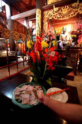 | Trước bàn thờ Mạnh Tử, nhà triết học Trung Hoa xưa, cô gái với xấp tiền lẻ đang tập trung cầu nguyện. |