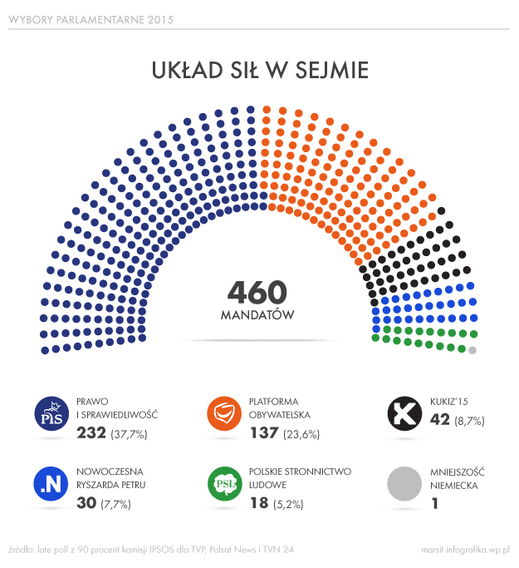 Theo thăm dò dư luận mới nhất sau bầu cử của hãng Ipsos theo đơn đặt hàng của TVP1, TVN24 và Polsat News, kết quả thằm dò của 90 % đơn vị bầu cử vào quốc hội, ngày 25. 10. 2015, được công bố sáng 26. 10 như sau