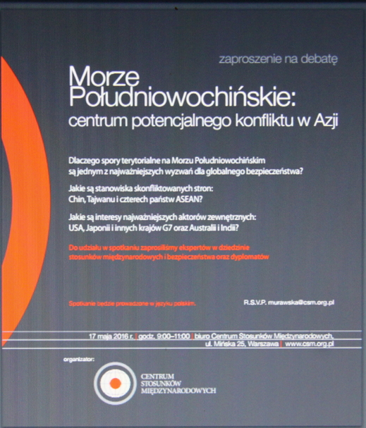 Trung tâm Quan hệ Quốc tế Ba Lan (CSM) sẽ tổ chức cuộc Hội thảo với chủ đề “Biển Đông: tâm điểm của những xung đột tiềm tàng ở châu Á” từ 9:00 – 11:00 ngày 17/5/2016 tại trụ sở CSM (Minska 25, Warszawa). CSM sẽ công bố một báo cáo đặc biệt về vấn đề này và sẽ giới thiệu tại Hội thảo.