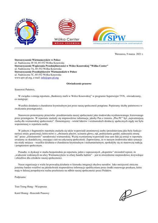 Hội Người Việt Nam tại Ba Lan Hiệp Hội Hỗ Trợ Doanh Nghiệp vùng Wólka Kosowska "Wólka Center" Hội Doanh Nghiệp Việt Nam tại Ba Lan Thông cáo báo chí Kính thưa các Ngài, Liên quan tới việc phát sóng phóng sự "Mafia ngân hàng ở Wólka Kosowska" của chương trình Superwizjer TVN chúng tôi tuyên bố như sau: