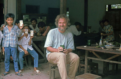 Ngày ấy hình ảnh một ông Tây đi du lịch còn xa lạ với người Việt. Hans-Peter đi đến bất cứ đâu, đám trẻ con tò mò bám theo xin được sờ râu, giật lông tay và ông thích cảm giác những đứa trẻ vây quanh mình. Ảnh: NVCC. |