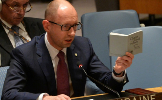 Thủ tướng lâm thời Ukraine, Arseniy Yatsenyuk nói với Hội đồng Bảo an rằng Ukraine là nạn nhân bị Nga xâm lược, và đưa ra bản sao Hiến chương Liên Hiệp Quốc nhằm chứng minh luận điểm Moscow vi phạm bản hiến chương và một số hiệp ước quốc tế khác.