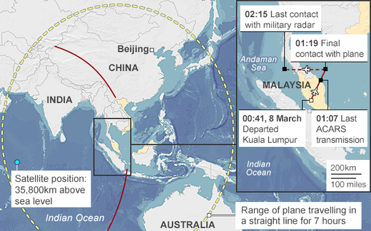 Chính phủ Malaysia cho biết chiếc máy bay này đã bị cố tình đổi hướng và có thể đã bay theo hành lang bắc hoặc hành lang nam.