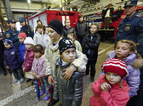 Trẻ em Ukraine tới thăm quan một trạm cứu hỏa ở thành phố Krasnoyarsk, Nga. Ảnh: Reuters. |