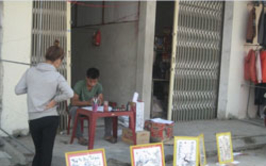 Có người viết thư pháp lên giấy lụa, giấy bản dày và cuộn thành bức để bán, cũng có người vẽ rồng, vẽ hoa, vẽ trúc, vẽ ong bướm và nhiều thứ khác lên giấy, mo cau, mo nang làm nền, sau đó vẽ con chữ lên đó và treo bán. Vì phần lớn những người này là sinh viên có điều kiện kinh tế tương đối khó khăn, nên việc cần mẫn kiếm tiền bằng nghề viết thư pháp của họ bao giờ cũng cho một cảm giác nào đó vừa nỗ lực, vừa bi thảm, khó nói.