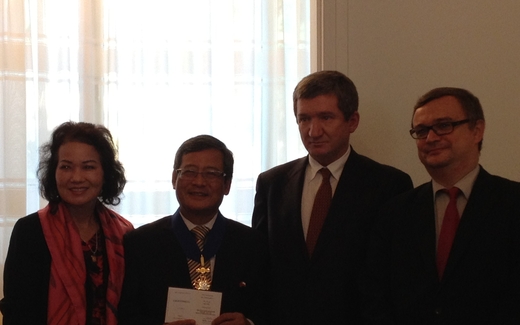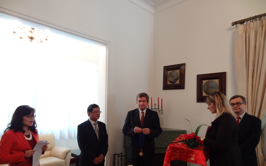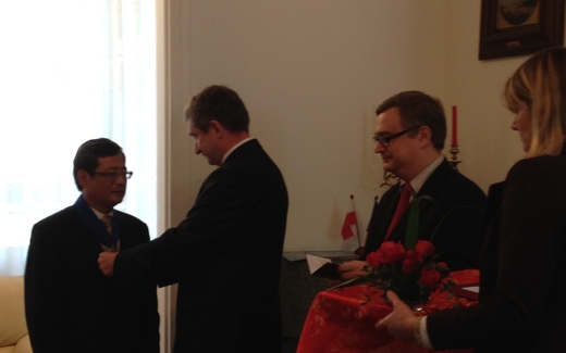 Trước buổi chiêu đãi, Đại sứ quán Ba Lan đã trọng thể tổ chức Lễ trao Huân Chương Công trạng của Nhà nước Ba Lan cho Ông Nguyễn Hoằng nguyên Đại sứ Việt Nam tại Ba Lan. Được sự ủy nhiệm của Tổng thống Cộng hòa Ba Lan Bronislaw Komorowski, Ngài Phó Chủ tịch Hạ Viện Cộng hòa Ba Lan đã gắn Huân chương Công trạng - Phần thưởng cao quý của Nhà nước Ba Lan cho Ông Nguyễn Hoằng ghi nhận những đóng góp của ông trong nhiều năm công tác tại Ba Lan đặc biệt là thời gian giữ cương vị Đại sứ Việt Nam tại Ba Lan cho sự phát triển mối quan hệ hữu nghị và hợp tác giữa hai nước Việt Nam và Ba lan. Ông Nguyễn Hoằng đã xúc động bày tỏ tình cảm biết ơn sâu sắc đối với Nhà nước Ba Lan đã trao tặng Huân chương cao quý và hứa sẽ làm hết sức mình dù ở trên cương vị nào để góp phần đưa hai dân tộc Việt Nam và Ba Lan xích lại gần nhau mặc dù xa xôi về địa lý, vun đắp và tăng cường hơn nữa tình hữu nghị và phát triển sự hợp tác vì lợi ích của hai dân tộc Việt Nam và Ba Lan.