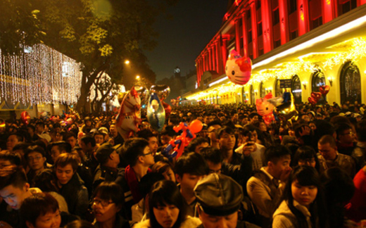 Càng về khuya, dòng người chen chúc nhau đổ về khu vực hồ Gươm càng đông.