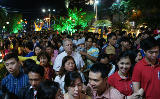 Tại TP HCM, thay cho cái vắng vẻ của vài giờ trước đó, trời vừa sẩm tối, nhiều tuyến đường dẫn từ các quận đổ vào khu trung tâm đã bắt đầu đông nghịt. Phần lớn khách du xuân là bạn trẻ hoặc những cặp vợ chồng con cái chở nhau bằng xe máy. Hơn 20h, trục đường Đồng Khởi, Lê Duẩn, Lê Lợi, khu bến Bạch Đằng quanh điểm bắn pháo hoa hầm Thủ Thiêm gần như chật kín.