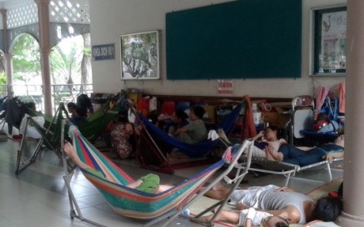 Tại khu vực bệnh nhân tay chân miệng, hành lang tầng trệt là la liệt chiếu, giường xếp và những cánh tay cầm quạt nan, quạt giấy quạt cho các cháu bé. Một bà mẹ trẻ bồng con chừng 2 tuổi không mặc áo quần nói: “Nóng quá, mặc đồ bé không chịu. Thôi cho ở trần vậy...”. Phòng bên cạnh, một em bé khác cũng không mặc đồ đang lẫm chẫm đi ra.