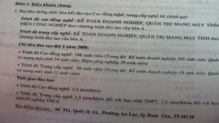 | Điều khoản giữa bên A (Trường CĐ nghề Kỹ thuật công nghệ TP.HCM và bên B (Công ty Cổ phần Bách Nghệ) thời gian tháng 3/2008 không hề có chương trình nào liên kết nào là hệ liên thông. |