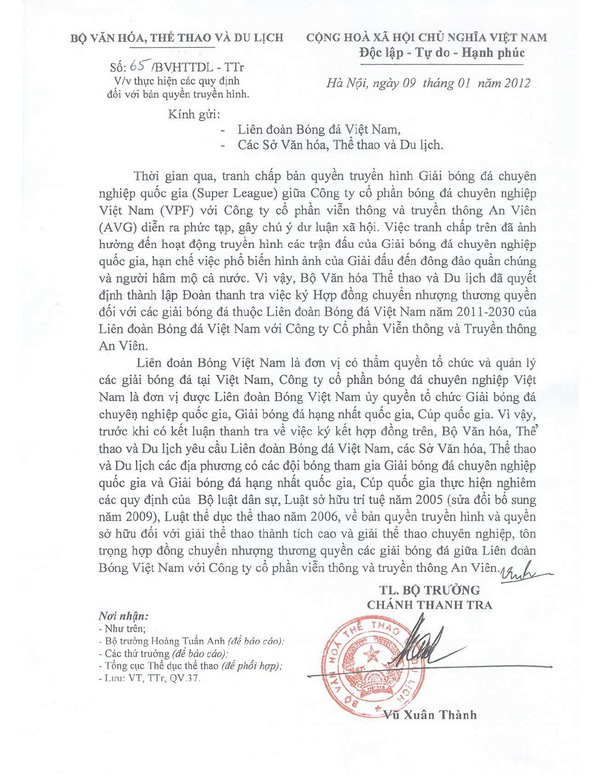 Nếu lấy ngày 14/12/2011 là cột mốc để khởi đầu cho “cuộc chiến” về bản quyền truyền hình giữa bầu Kiên, VPF với VFF và AVG thì sự xuất hiện của bản công văn số 65/BVHTTDL-TTr từ Bộ Văn hóa, Thể thao và Du lịch nói trên không thể coi là sớm, vì tính sơ qua thì thấy cũng phải mất gần 1 tháng. Thế nhưng, dẫu sao dù muộn cũng còn hơn không, bởi việc BTC sân Lạch Tray phải lập biên bản chấp bản quyền truyền hình vào ngày 7/1/2012 vừa rồi, hay việc người hâm mộ ở Nghệ An và Khánh Hòa phẫn nộ vì không được theo dõi trực tiếp 2 trận TĐCS.ĐT-SLNA và K.KH-V.NB như thông báo của VFF và báo chí cũng có thể coi như là giọt nước làm tràn ly.