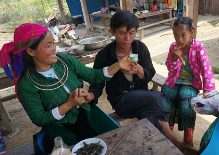 Lại rượu, đến chợ này mà không biết uống rượu thì thật vô vị. Mới lướt qua một góc chợ mà chúng tôi đã “nếm” hơn 10 chén rượu. Những dãy bàn kê sít nhau, muốn nhờ đi qua cũng phải “thăm nhau một tí”, đố mà từ chối được. Tôi được mọi người chỉ cho một bàn rượu của một “gia đình hạnh phúc”.