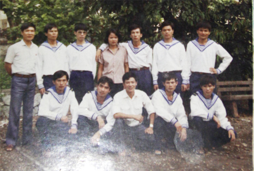 9 người lính Trường Sa (mặc áo hải quân) sống sót được quân Trung Quốc thả về sau 3 năm giam giữ (ảnh chụp tại trại an dưỡng ở Quảng Ninh năm 1992). Ông Hiền (ngồi hàng đầu, ngoài cùng bên trái); vợ chồng ông Phụng đứng giữa - Ảnh do ông Trần Thiện Phụng cung cấp